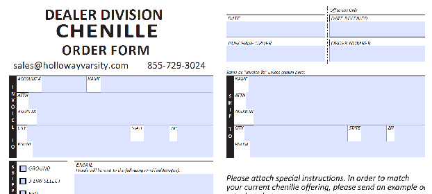Click here to fill out the chenille order form and then emailĀ sales@hollowayvarsity.com.